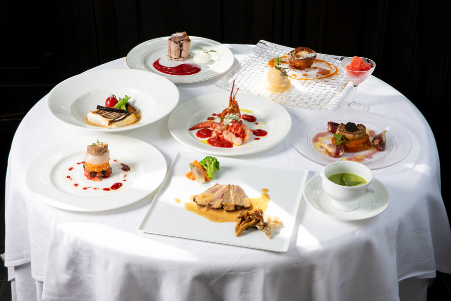 移りゆく季節を映すオードブルは、グランメゾンの証といえる4皿。魚料理は活きたオマール海老など2種類からチョイス。仏産高級肉や最上級の黒毛和牛など3種類から選ぶ肉料理、四季を彩る2皿のデザートとカフェ&小菓子へと続きます。