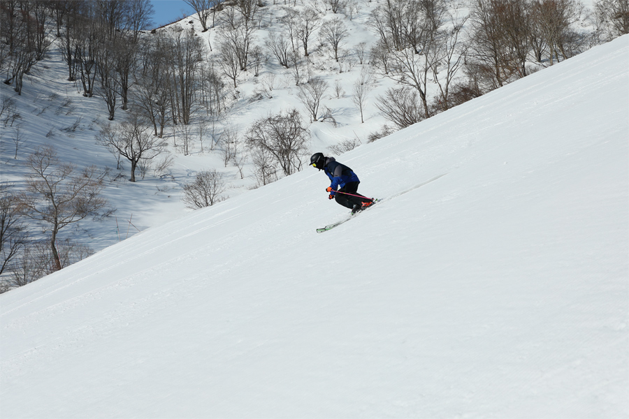 The Wakaguri Central Slope had groomed corn that was softer than the Rabbit Course, while the Wakaguri Forest Course (pictured) had full-on loose granular corn snow. On the Wakaguri Forest Course, skiing with flat bases created a slight drag, so I consciously kept my skis on edge.