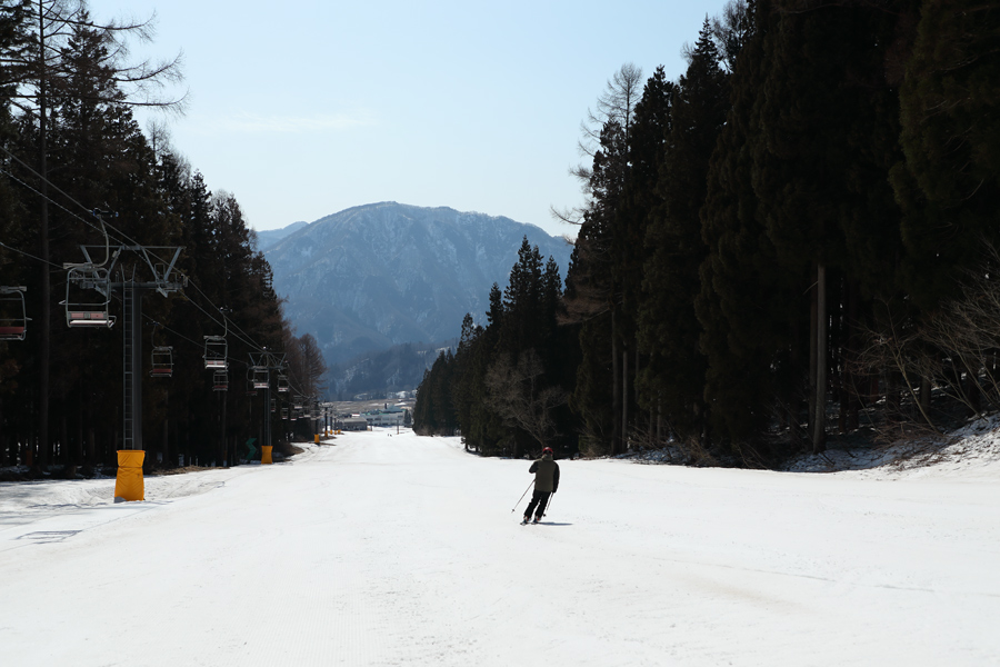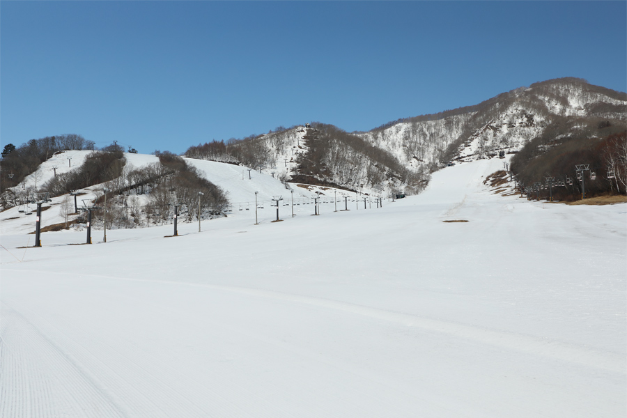 With the No. 8 Pair closing on 3/20 (Fri., holiday) and the No. 9 Pair, No. 10 Pair, and the Alps No. 3 High-Speed Pair ending operations on 3/22 (Sun.), Hakunori is now operating with four lifts—the No. 1 Pair, the No. 4 Pair, the Alps No. 5 High-Speed Pair, and the Alps No. 6 High-Speed Pair—and four courses: the Hakunori Family Course, the Wakaguri Central Slope, the Rabbit Course, and the Wakaguri Forest Course. This morning the Rabbit Course (pictured) had groomed corn snow that had softened to a moderate degree.