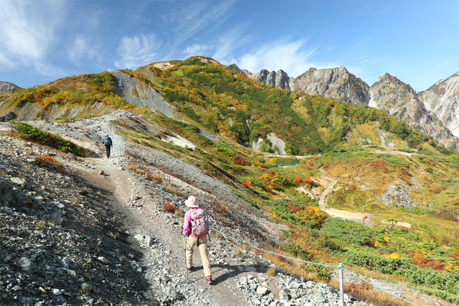 標高2,060mにある八方池周辺(写真)が「色づき半ば」になりました。「ここ数日の冷え込みで一気に色づきましたね。」とはグラートクワッドのリフトマンさん。山だけでなく、朝方のハイカーと登山者の服装もニット帽だったり厚手のシャツやパンツだったりと、すっかり秋の装いに変わっていました。