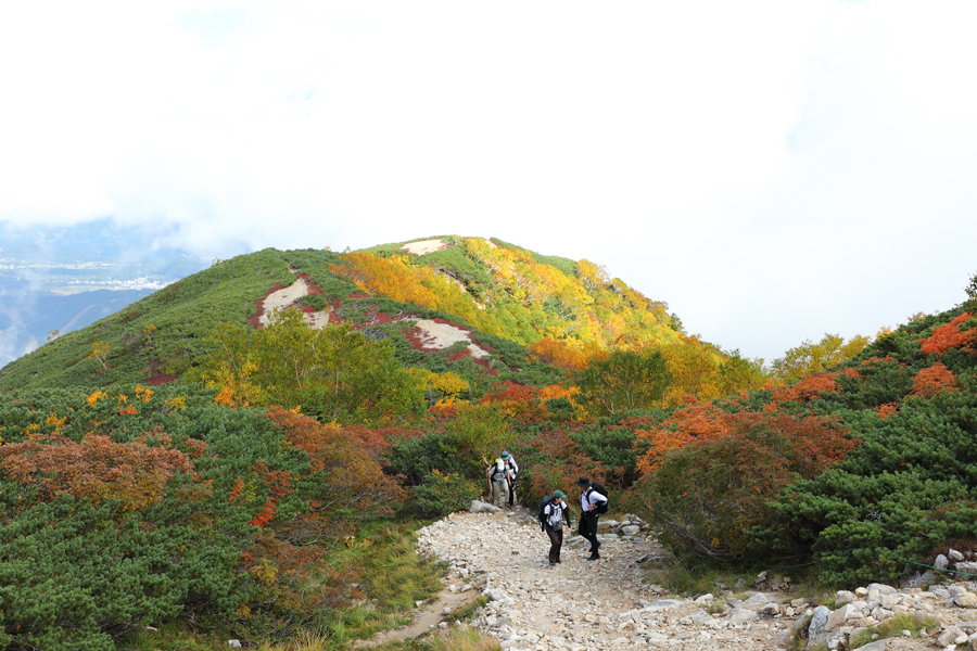 「自分がイメージしていた紅葉の感じにドンピシャのタイミングで来れました。本当にきれいで感動しました。」とはお会いした埼玉県からの登山者さん。ガスに包まれてしまうこともありましたが、丸山ケルン手前で見えた青空に元気をもらい、ペースを緩めることなく11時に丸山ケルンに着きました。