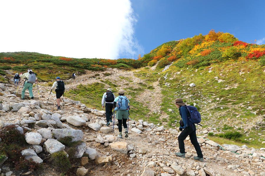 となれば、さらに上部の紅葉の状況が気になります。唐松岳方面から下って来た男性の「上は結構ガスが上がって来ていました。写真を撮るなら急いだほうがいいですよ。」との言葉に、休憩をほとんど取らずに丸山ケルンを目指しました。途中の下の樺は「色づき5~6分」、上の樺は「色づき6~7分」でした。