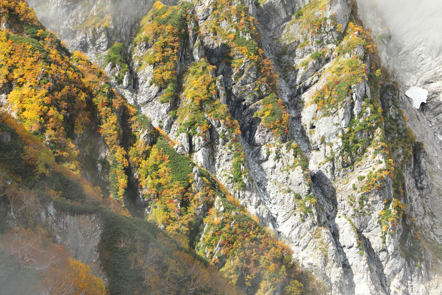 レポーターのお気に入りの撮影スポットは丸山ケルンから5~6分ほど登ったところにあります。唐松岳の稜線付近の紅葉は丁度見頃。ゴツゴツとした岩稜の無骨な質感と鮮やかな赤やオレンジ、黄のコントラストが絶妙で、南斜面から湧き上がるガスも相まって予想を超えた美しさでした。