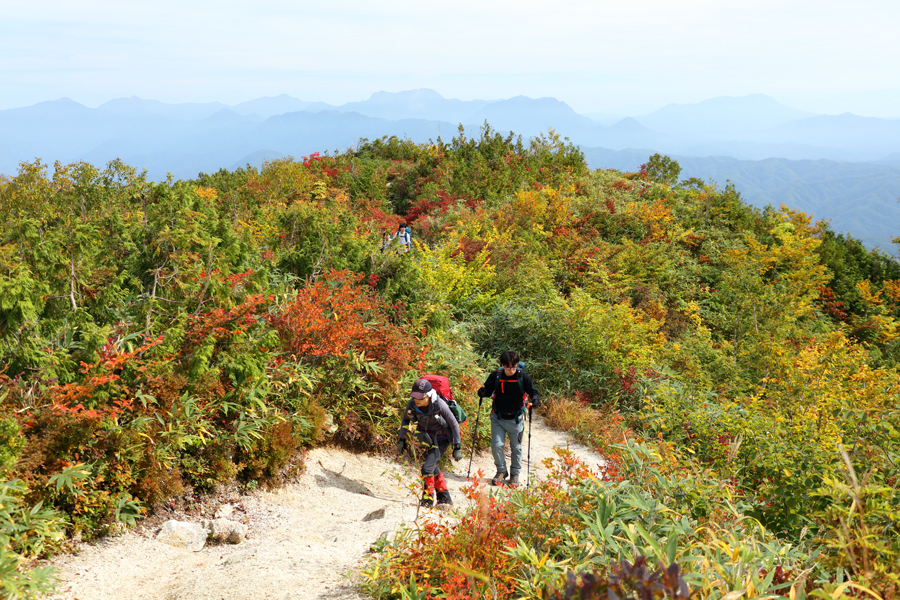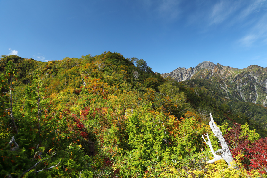 ブナとダケカンバにはまだ緑の葉が多く、カエデの仲間も緑~黄~橙と変化している最中。小遠見山トレッキングコース全体としては「色づき3~4分」といったところでした。晴天に恵まれた10/2(木)には華やかさが増した斜面と共に五竜岳(写真)や鹿島槍ヶ岳、唐松岳を望めました。