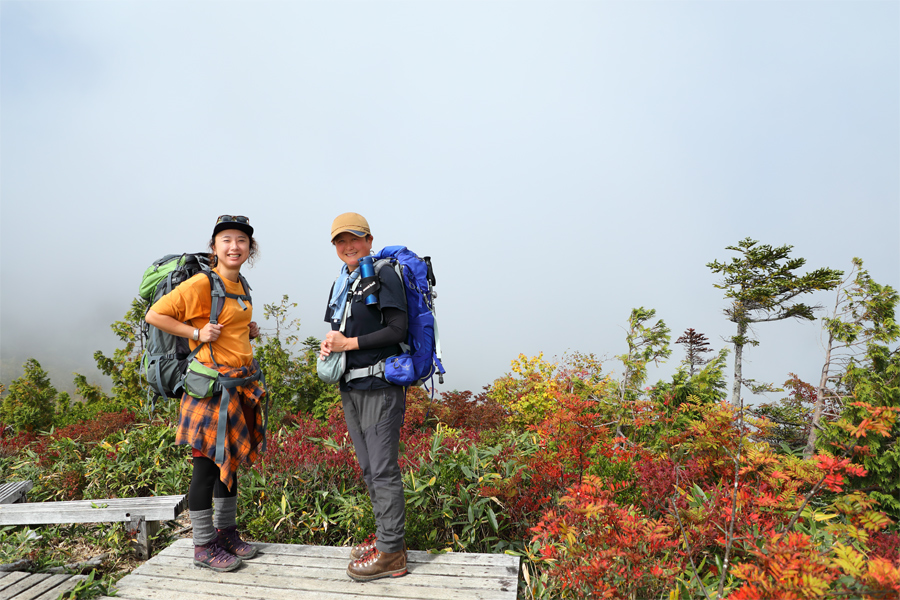 小遠見山の山頂で八方の郷土料理店 おひょっくり の女将さん(写真右)にお会いしました。「スノーナビさん、いつもお世話になっています!今日は五竜岳まで登り、明日に唐松岳まで縦走して八方に下山します。さぁ、中遠見、大遠見、西遠見、白岳と続くアップダウンに取り付きますか!」とお連れ様に発破をかけて登山道を進んで行かれました。