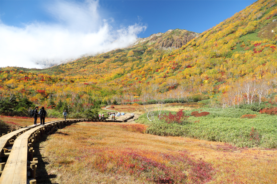 楠川~浮島湿原間にある開けた休憩場所からのワタスゲ湿原(写真)は、10/2(木)の取材時から鮮やかさがさらに増して感動的な美しさ。今まさに栂池自然園の紅葉がピークを迎えています。気温が+10℃と低くて風が冷たかったですが、強い日差しのお陰で寒さは感じませんでした。