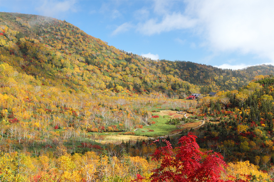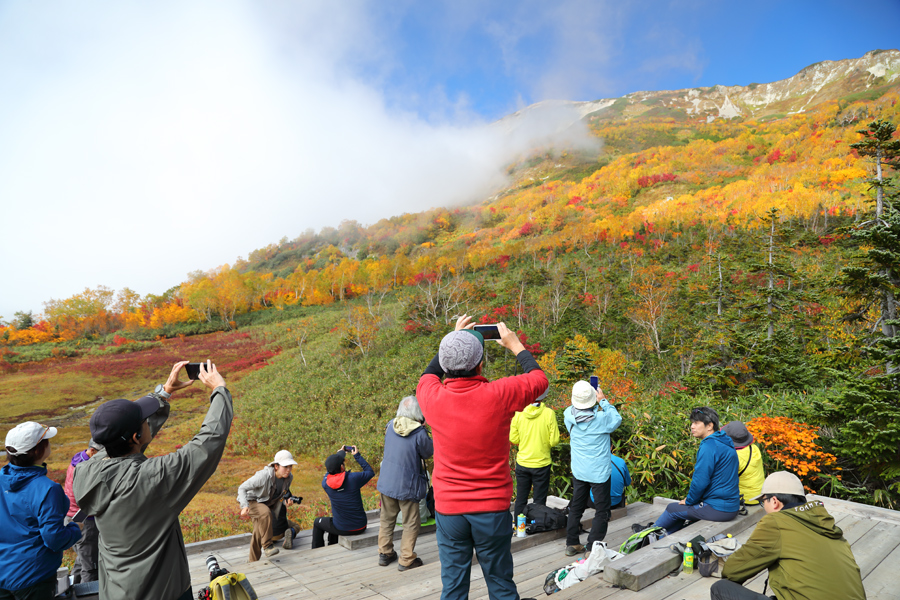 紅葉シーズン真っ只中の晴天予報とあって、平日にも関わらず営業開始前の栂池ゴンドラ山麓駅には長蛇の列ができました。「今年の紅葉は大当たりです。存分にお楽しみください!」とはつがいけロープウェイのスタッフさん。木道の改良工事が終わったワタスゲ湿原(写真)に出ると、素晴らしい色づきに続々と歓声が上がっていました。