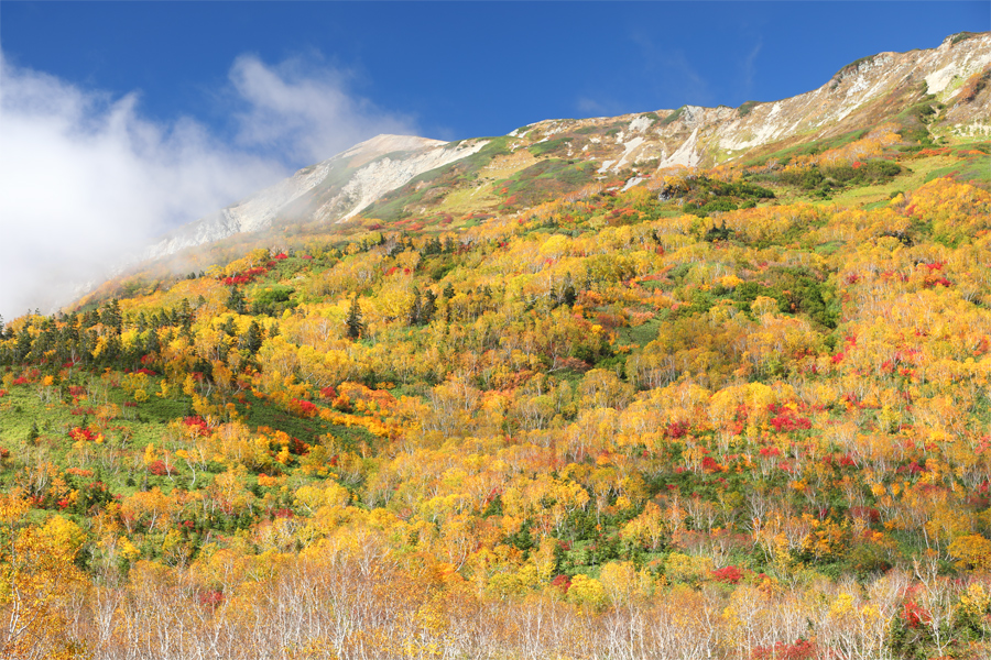 10時半頃に雲が解けて再び青空が広がりましたが、結局、展望湿原の時に望めた小蓮華山方面(写真)が本日最も美しい紅葉でした。帰り道でお会いした東京都からのハイカーさんが「いつも見てます!今年の紅葉が当たりだとレポートで見て、休みを取ってやって来ました。本当に最高ですね!」とお話しくださいました。