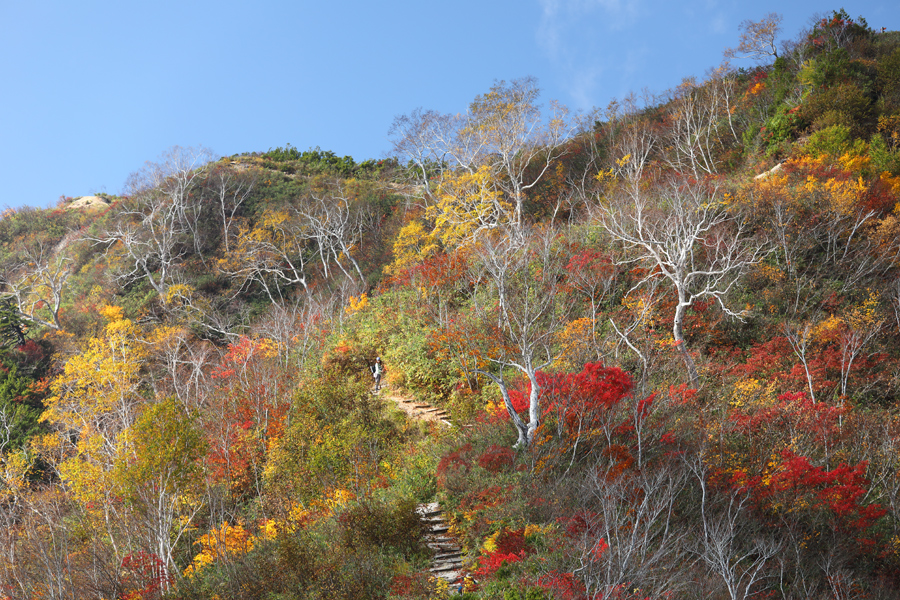 徳島県からの女性(写真中央)が「室堂山荘で働いてましたが下山してそのまま地元に帰るのがもったいないと思い、登りに来ました。最高ですね!」とお話しくださいました。落葉したダケカンバの白い幹がアクセントになった一ノ背髪~二ノ背髪の斜面に向かってカメラを向けるハイカーが多かったです。