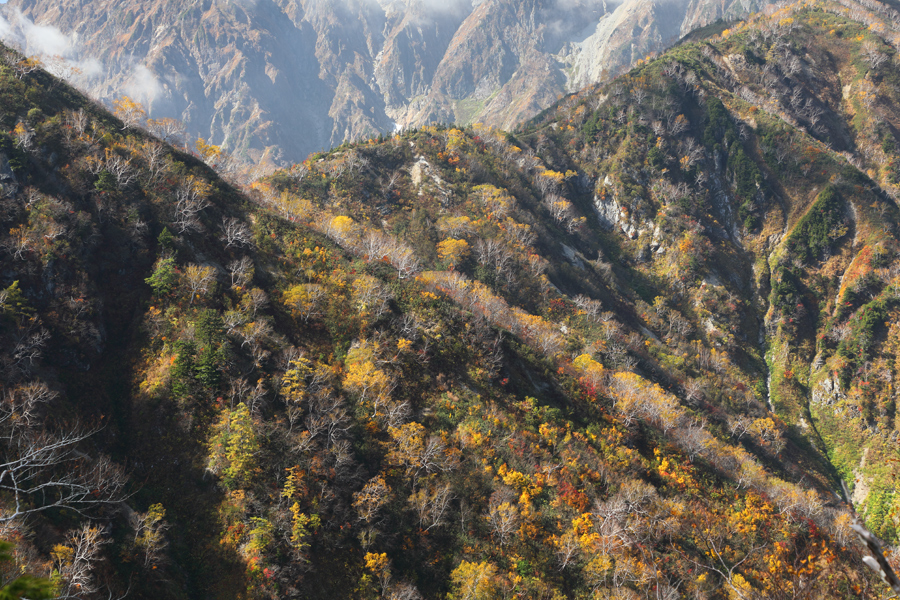 10/16(木)の終日続いた強い雨によるダメージですが、丸1日以上が経った今朝になると、ピークを過ぎていた地蔵ケルン~小遠見山山頂間で顕著に見られました。その一方で、より低い標高の紅葉への影響は少なく感じました。安曇野市からのご家族も「五竜は今日が3回目です。今年の紅葉はきれいですね。」とお話しくださいました。