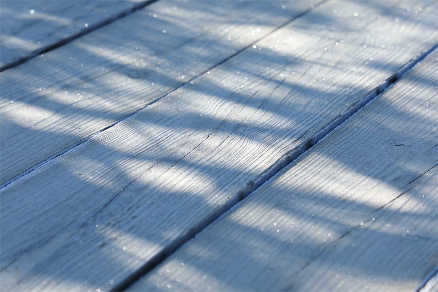 富士山の初冠雪が観測された10/23(木)の朝の白馬は快晴でした。放射冷却が効いた8時半現在のグラートクワッド乗り場の気温は+5℃。鎌池湿原では、霜に包まれた木道が朝日を浴びてキラキラと輝き(写真)、水溜まりには氷が張っていました(ということは、早朝は0℃以下になったということですね)。