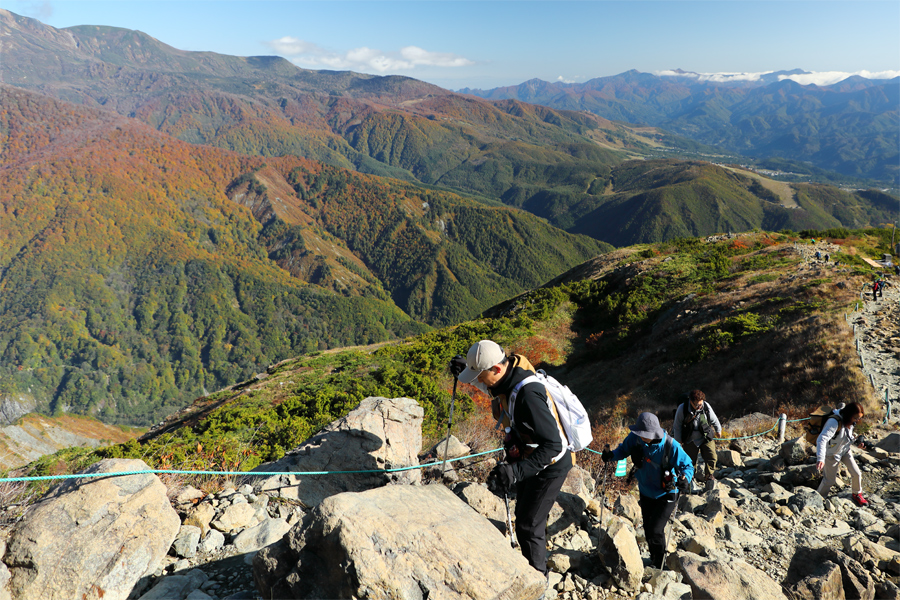 空気はキンと冷えていましたが、強い日差しと無風のお陰で、登り出しから寒さをさほど感じませんでした。紅葉の帯がゴンドラ線上部~兎平間の標高1,300~1,400mにまで下りたことで、尾根道ルートから見下ろす紅葉がきれいでした(写真)。一方、見上げれば、すっかり初冬の景色でした。