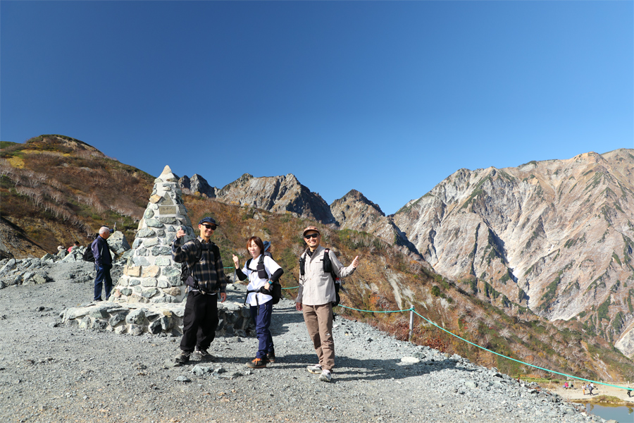 第3ケルンで「スノーナビさん、いつもお世話になっています。」とお声掛けくださったのは THE NORTH FACE GRAVITY HAKUBA の井立店長(写真一番右)。「休日を利用して友達と日帰りで唐松岳まで登って来ます。」とお話しくださいました。ダケカンバの白い幹が美しい下の樺方面へ登って行く人が、他にも数多く見られました。