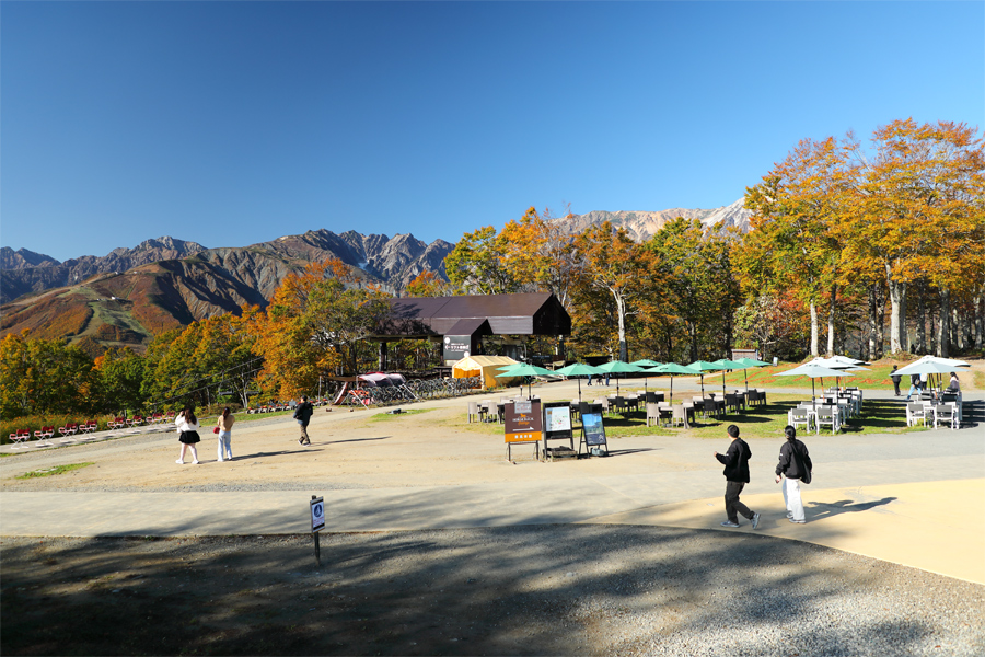 平日ながら本格的な紅葉シーズンに入ったこともあって早朝から来場者が多く、HAKUBA MOUNTAIN HARBOR(写真)はすぐに一杯になりました。日陰になる西向きのデッキには9時頃でも霜が。スリップしないように注意しつつ眼前に聳える山に夢中になる姿が印象に残りました。
