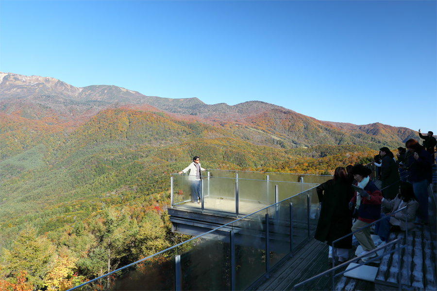 ゴンドラ山頂駅に降り立つと、独立峰・岩茸山(標高1,289m)の山頂ならではの開放感と澄み切った空気に包まれました。2日連続の秋晴れに。朝日を浴びたブナの木の紅葉と北アルプスがとてもきれいだったので、しばらく足を止めて眺めました。