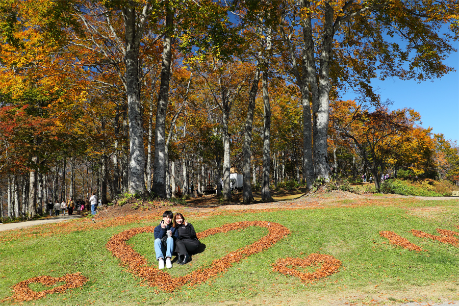 山頂のブナ林の入口には落ち葉を使ってハートマークと「IWATAKE」の文字が描かれています。愛知県からの男性(写真左)が「鹿児島県から遠距離恋愛中の彼女が遊びに来てくれました。三段紅葉にはまだ早かったですが、天気も景色も素晴らしくて大満足です!」とお話くださいました。