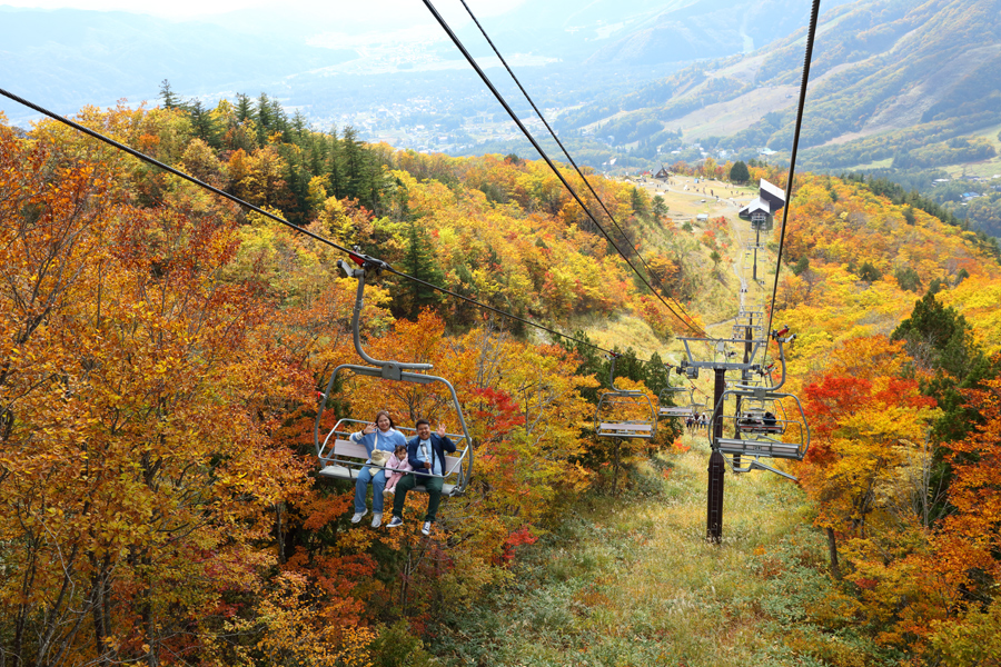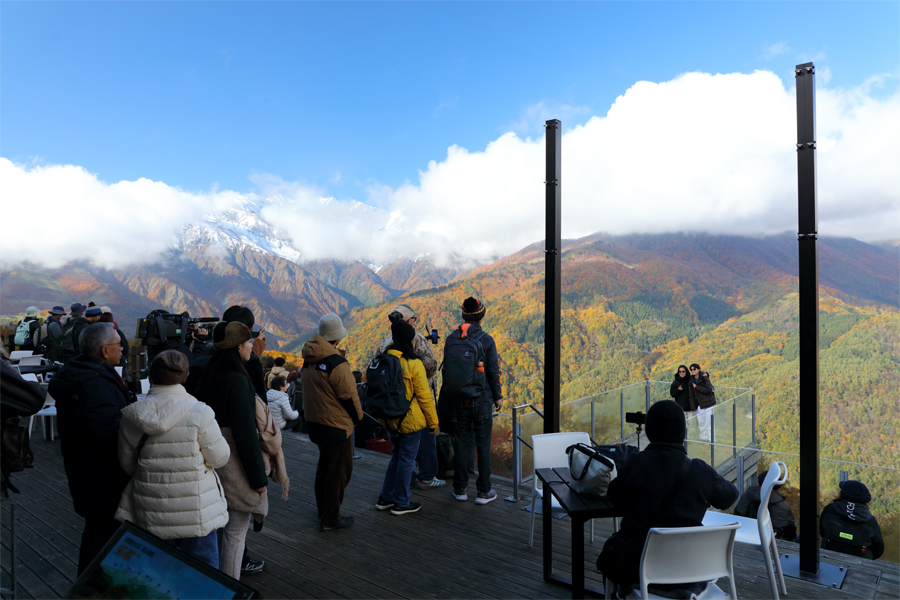 10/27(木)に後立山連峰に初雪が降り積もって以来、最初の晴天日を迎えました。HAKUBA MOUNTAIN HARBOR(写真)には山頂の雪の白、中腹の紅葉の赤、麓の緑が同時に望める白馬名物「三段紅葉」を体感しようと、観光客が続々と訪れていました。