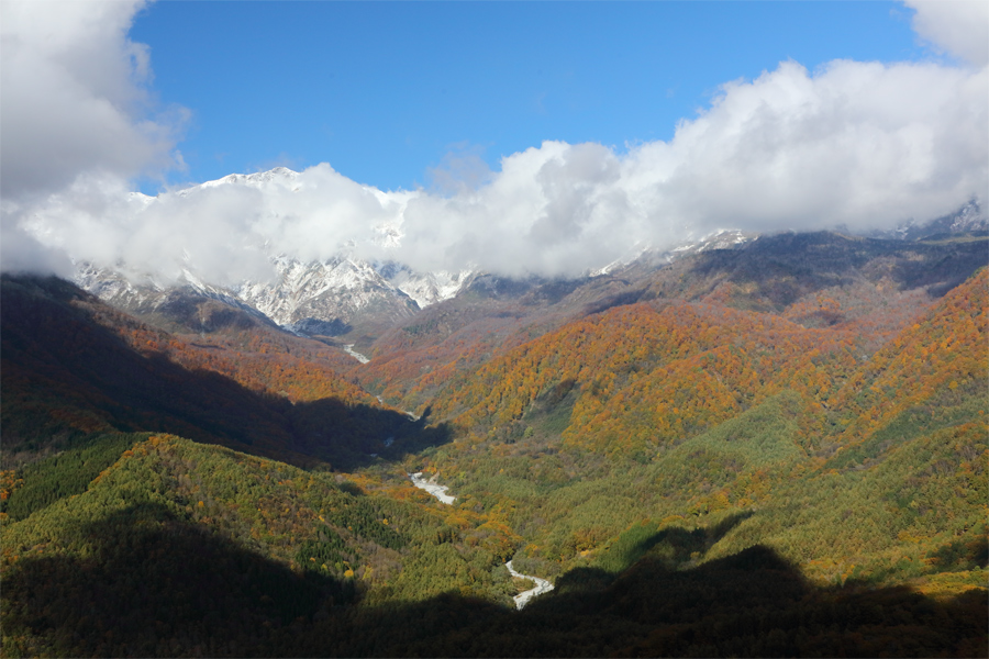 三段紅葉は標高差が大きくて、尚かつ一望できないと成り立ちません。しかも、10月下旬~11月上旬の短い間の晴天日に限られます。今年は紅葉に傷んだ葉が少ないこともあって、2014年以来11年ぶりの”当たり年”と言われています(写真は後立山連峰の最高峰、標高2,932mの白馬岳)。