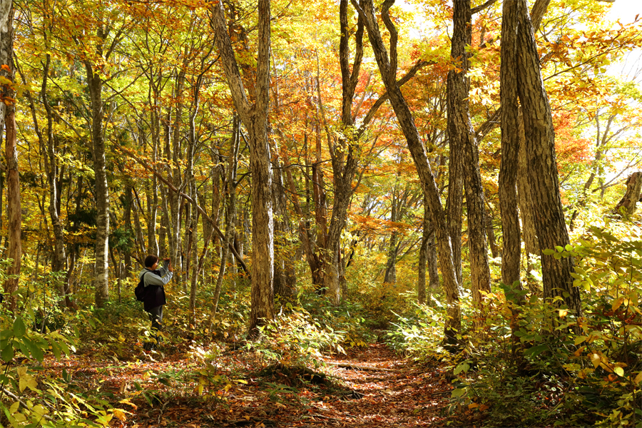 岩岳山頂から少し標高を下げる ねずこの森(写真)は「色づき5~7分」。ねずこの巨木、東屋を過ぎた先の分岐を左へ進むと、カエデの見事な色づきが待っていました。落ち葉で埋まった柔らかなルートから上がるサクサクという音と共に紅葉狩りを満喫しました。