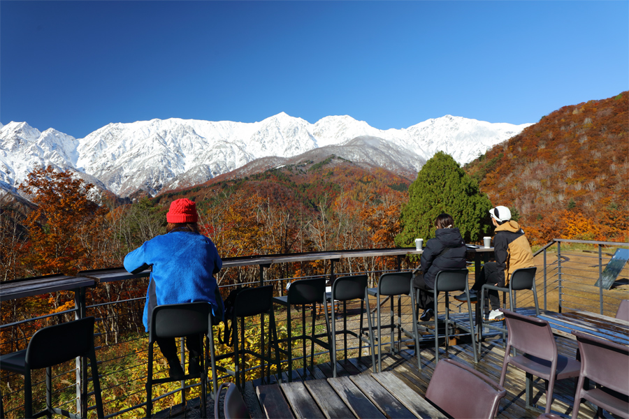 除雪されたとはいえ雪が凍って残っていた HAKUBA MOUNTAIN HARBOR のテラス(写真)では、安全のため入れる場所が規制されていました。それもあって中央の凸部分で記念写真を撮る人の行列が橋をはるかに超えて続いていました。11/8(土)16時からはここで大サービスのイベント「IWATAKE AUTUMN NIGHT 2025」が行われます。