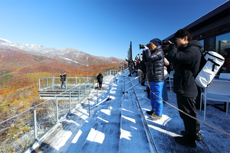 晴天に恵まれ観光日和となった11/4(火)朝の岩岳山頂には、2025-2026冬シーズン初となる雪が3cmほど積もっていました。ゴンドラ山頂駅に着いて早々に、サウスゲレンデの雪越しの見下ろす景色を写真に収める人が多かったです。HAKUBA MOUNTAIN HARBOR に向かう途中のブナの森では融けた雪が水となってポツポツと落ちて来ました。