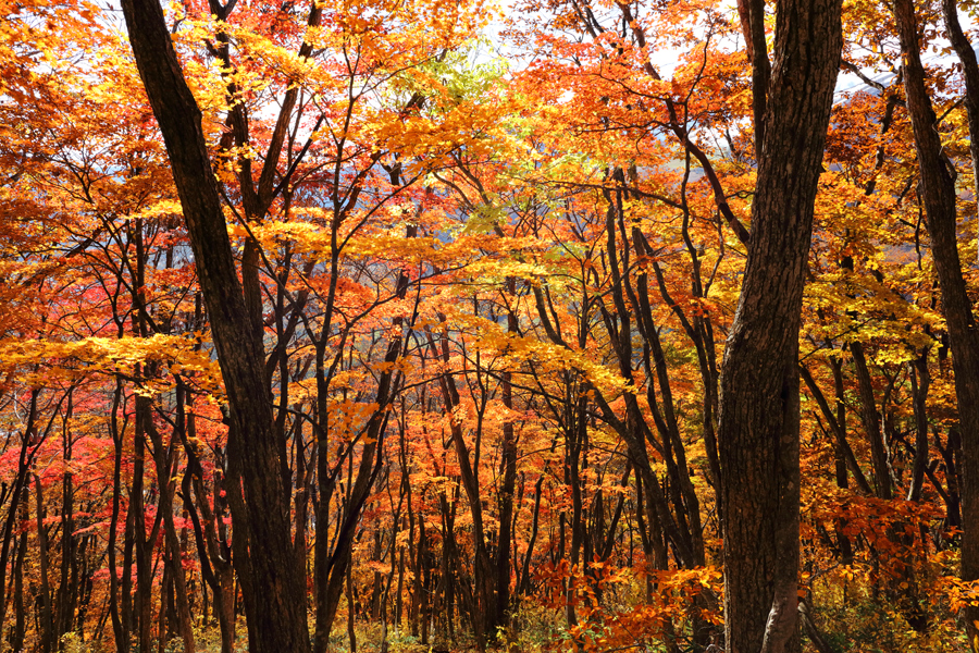 紅葉のほうは岩岳山頂でも 白馬ヒトトキノモリ でもピークを過ぎましたが、標高が下がる ねずこの森 の最奥(写真)は見応えがありました。陽光を浴びて鮮やかに輝くカエデを中心にした紅葉に、何度も足を止めてカメラを向けました。
