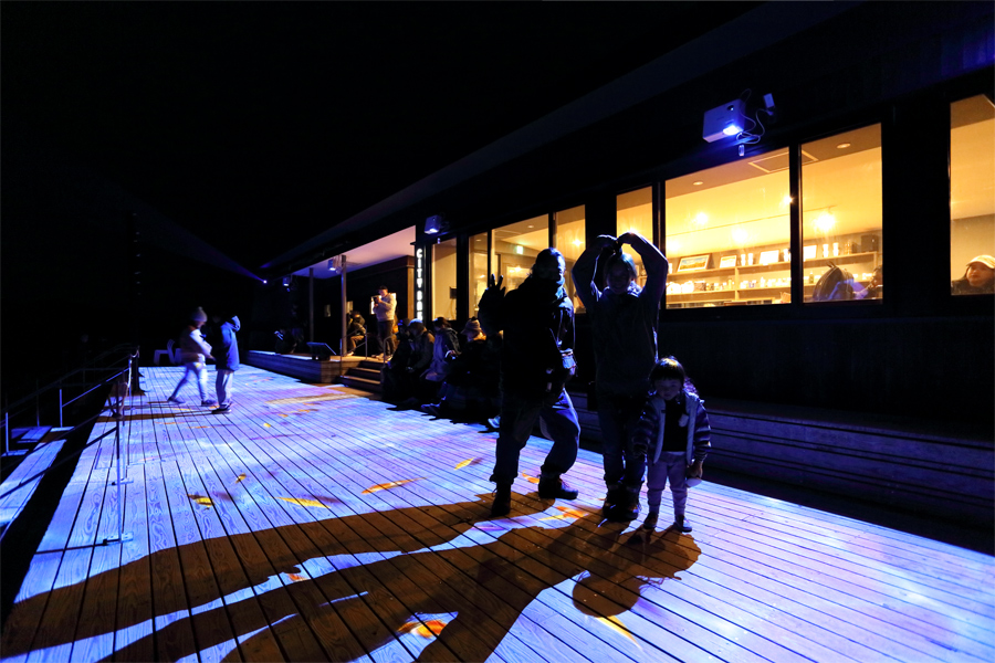 初の催し物となる「ナイトバブルパフォーマンス」(写真、by AWABITO)には小さな子供を連れた家族を中心に多くの人が集まりました。今までに体験したことのない幻想的な光景!無数のシャボン玉が舞い上がる度に歓声があがり、大喜びの子供たちがそれを捕まえようと手を伸ばしていました。