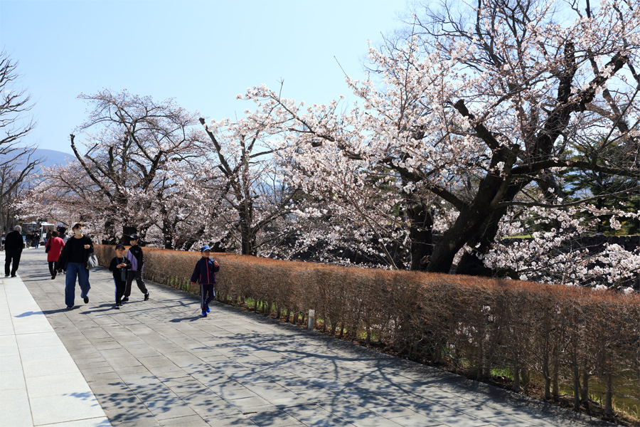 外堀(写真)には歩道側に一部の枝が張り出して桜のトンネルが出来ていました。お堀を覗けば水面に写り込む桜並木も。女鳥羽川やナワテ通り一帯の桜も「5~6分咲き」になったことで、松本城公園だけでなく、気になるお店に立ち寄りながらの街歩きがいつも以上に楽しく感じられました。