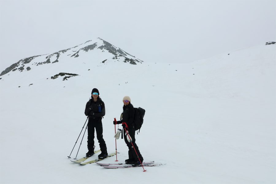 香港出身、日本在住のお2人(写真)が「スノーナビは見たことあります。春に立山に滑りに来るのは初めてです。」とお話しくださいました。平日とはいえ室堂駅を始めとしてどの駅も賑わっていて、観光客だけでなく立山や浄土山(写真左奥)へ向かうバックカントリースキーヤー&スノーボーダーも数多く見られました。