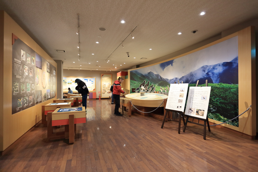 風の強い日や今日のような雨の日は「立山自然保護センター」(※入場無料)で立山の貴重な動植物の展示や映像を楽しむのもよいかもしれません。同館2階(写真)ではライチョウの仲間と生態、室堂平に生息する高山植物等について知ることができます。いずれにしても観光目的の場合、今時期は水の沁みないスニーカーかトレッキングシューズがおすすめです。