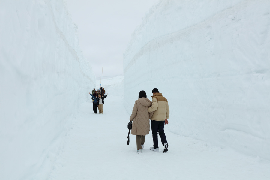 “雪の小谷”とも言われる「雪の回廊」(写真)は両サイドに迫る雪壁はもちろん、足元も白くてきれいなので絶好のフォトスポットになっていました。メインイベントの「雪の大谷ウォーク」の雪壁の高さは12m(※昨年は16m)。雪の大谷の写真は次回、晴天日を狙って取材に来る時に掲載したいと思います。