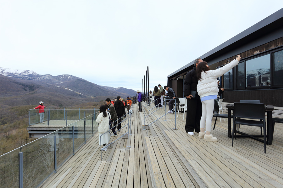 4/23(木)の8時半から 白馬岩岳マウンテンリゾート の夏季営業が始まりました。雨予報でしたが、HAKUBA MOUNTAIN HARBOR にはオープンしてすぐに観光客が入り出しました(写真)。新登場の「テラスの凸部分でのスタッフによる無料撮影サービス」も初日から行われていました(*)