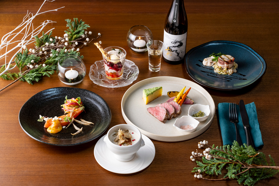 コートヤード・バイ・マリオット 白馬 の Dining & Bar LAVAROCK は、宿泊者だけでなく外来でも利用できます。12/1(月)~3/31(火)の夕食では、信州の恵みを五感で味わい尽くす冬のディナーコース「Shinshu Blessings Dinner -Winter-」を提供(写真)。「PRESTIGE」コース(写真)では、信州サーモンのマリネと信州産カラフル根菜のジュリアンサラダから、フォアグラのフランと長野県産キクイモのヴィロードスープ、安曇野食工房のベーコンを巻いた鱈のグリル、信州味噌に漬けた信州アルプス牛のグリル、そしてデザートの白馬農場のブルーベリーとマロンクリームのミニパフェへと続きます。