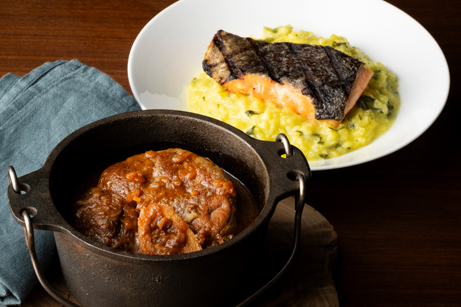 長野県産赤ワインとりんごの割り下と共に頂く「りんご和牛信州牛のすき焼き」や、安曇野刻みわさびとヒマラヤ紅塩で頂くりんご和牛信州牛リブアイのグリル、信州和牛とラクレットチーズのハンバーガー、仔牛の骨付きスネ肉を白馬産ミニトマトや長野産白ワインと煮込んだ「白馬産ミニトマトでじっくり煮込んだオッソブーコ 」といったアラカルトメニューもオーダーできます。