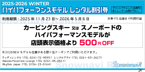 カービングスキー・スノーボード ハイパフォーマンスモデルレンタルを店頭表示価格より500円OFF!