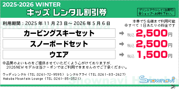 キッズ スキー・スノーボード レンタル1日セット2,500円、ウェア1,500円!
