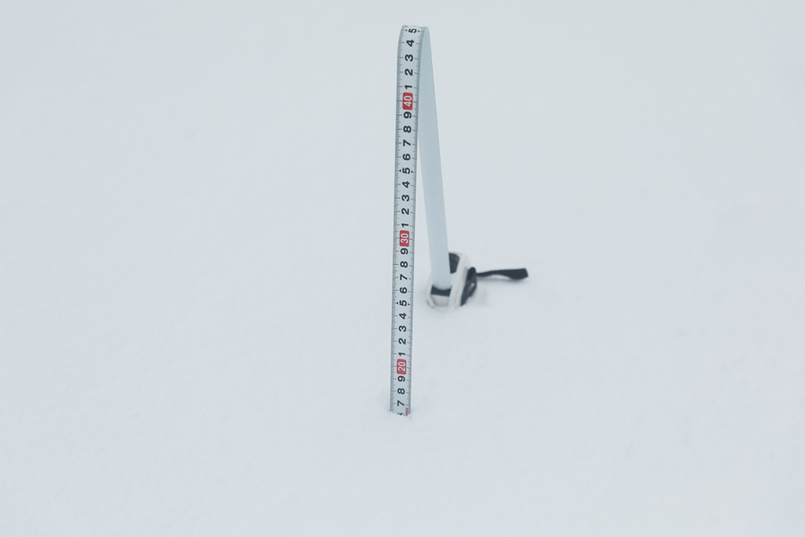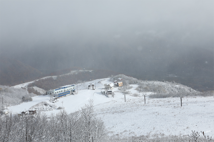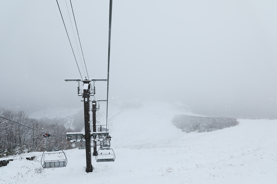 8時現在の麓の雨が標高約1,200mで霙(みぞれ)に変わり、兎平では強めの北西風に乗って少々湿った雪が降っていました。「一晩でずいぶんと積もりましたね。気を付けて行ってらっしゃい!」とはアルペンクワッドのスタッフさん。スキー場トップへと標高を上げるほどに風が強く、また、降る雪の密度が濃くなりました。