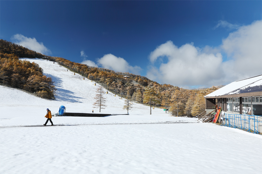 カラマツ林を中心にした高地ならではの美しい自然景観と、浅間山などの名峰を望む大パノラマ、整ったセンターハウス(写真、売店が少し広くなりました)とレストラン、ホテル。東信エリアでひときわ輝く 高峰マウンテンパーク に初雪が到来しました!湿った新雪がゲレンデ全体に約5cm積もっていました。