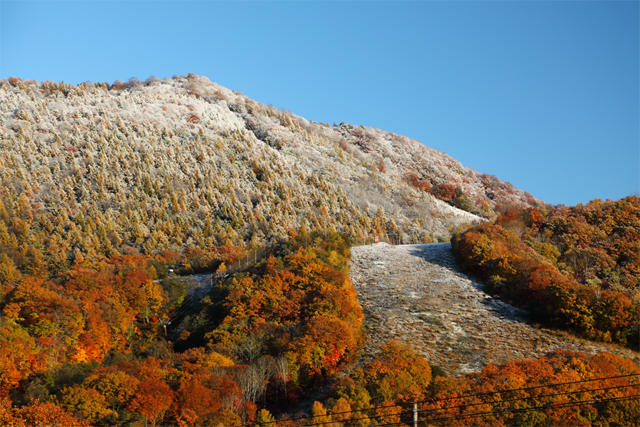 それにしても白銀の鹿島槍ヶ岳(写真右、標高2,889m)、爺ヶ岳(写真左、標高2,670m)と紅葉の共演が素晴らしかった!「明け方に写真を撮りにやって来ました。モルゲンロートもきれいでしたよ。」とはお会いした松川村からの男性。ちなみに、黒沢ゲレンデに白く見えるものは雪ではなく霜です。