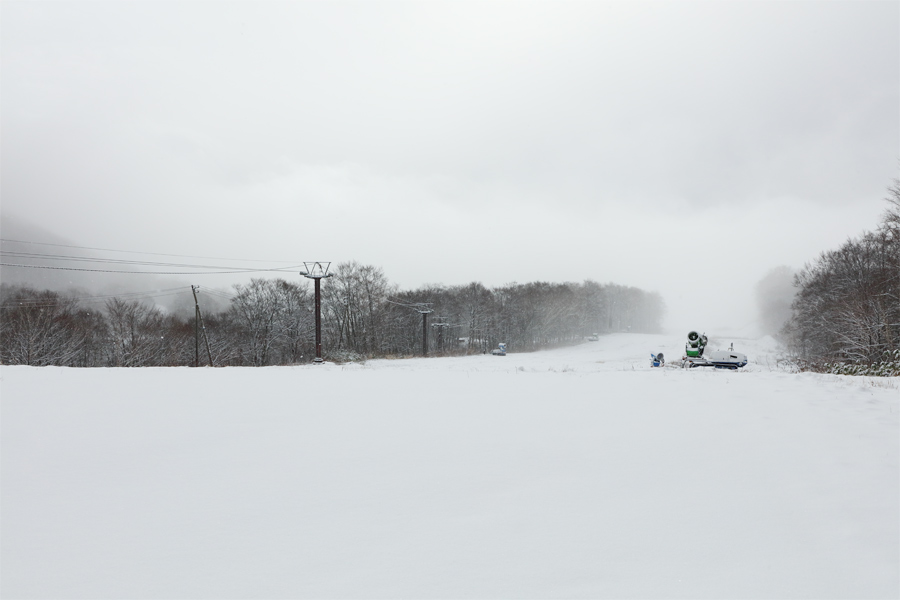 昨シーズンより1日早い下部ゲレンデへの初積雪!1cm足らずの湿った雪でしたが、ハンの木(写真)や丸山、鐘の鳴る丘の草が刈り取られたバーンがうっすら白く染まりました。標高を上げて行くと、同様に湿った雪が白樺ゲレンデ序盤に約3cm、ハンの木ゲレンデ中盤に約5cm積もっていました。