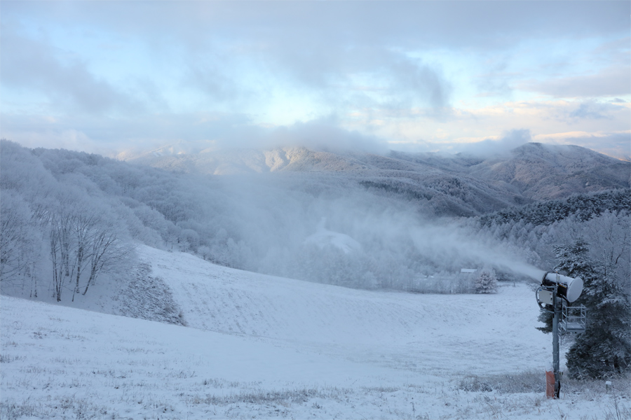 標高の高い内陸部という特性を生かして、11月オープンに名乗りを上げた ニンジャスノーハイランド。-5℃まで冷え込んだ11/19(水)の朝は固定式だけでなく移動式の降雪機も出動して、ブラックビート全面で降雪作業が行われていました。順調な冷え込みが続けば11/29(土)にオープンする予定です。