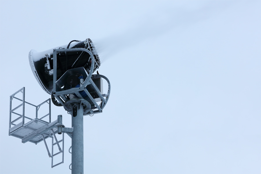 メインで稼働しているのは、北米No.1シェアを誇るSMI社製の最新のスノーマシン(写真)です。近寄ってみると、あたりに積もった人工雪は約15cmでした。ちなみに、昨晩から今朝にかけて積もった天然雪は7cmほどで軽い感触でした。
