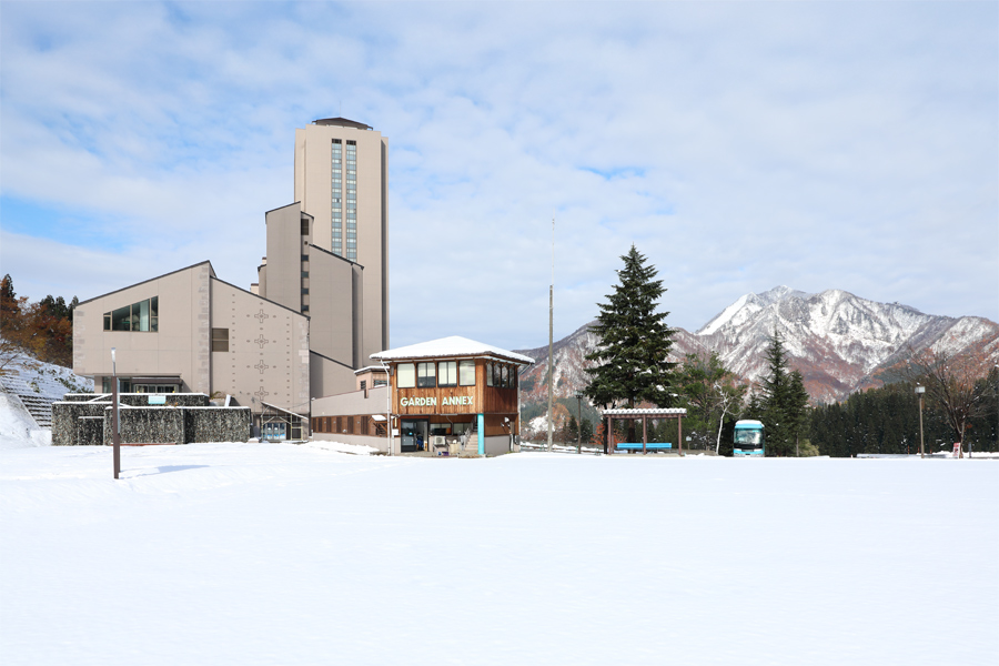 帝国ホテル、ホテルオークラとともにホテル「御三家」と称される日本の名門ホテル、ニューオータニ のグループホテルである ナスパニューオータニ が湯沢にあります。ホテルの目の前にある直営のスキー場、NASPAスキーガーデン にもホテルと同様に上質な雰囲気が漂っていました。ベースエリアの雪の上には真っ赤な椛の葉が沢山見られました。