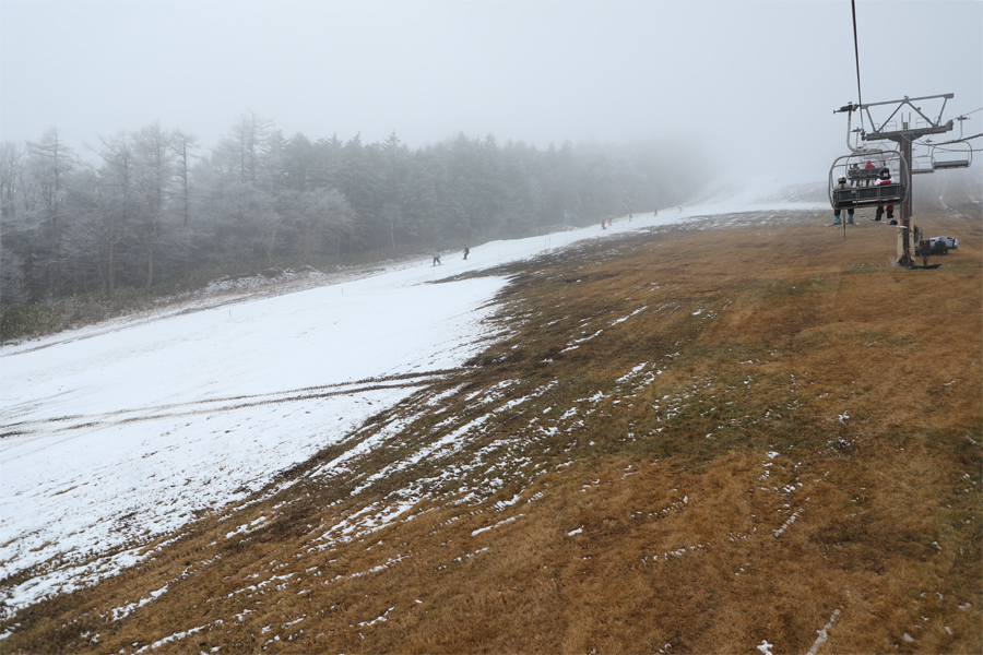 11/18(火)~11/19(水)の寒気流入時はさほどの積雪になりませんでしたが、菅平高原スノーリゾート には最新の人工造雪機「MND SNOW」があります。昨季と同日=11/22(土)、同積雪量=30cmにて、ステージ3リフト(写真、445m)が動いて裏太郎ァミリーイーストコースがオープン!菅平の冬が始まりました!