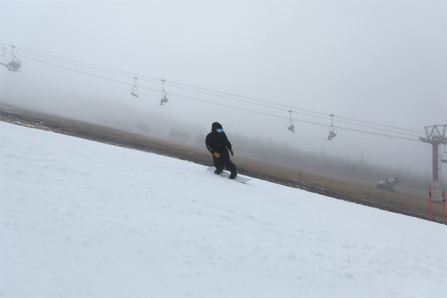 気温+1℃という高めの気温の中、朝方のコース序盤(写真)~中盤は濃いガスに包まれることが多かったです。コース幅が序盤で約10m、中盤で5~8m、終盤で約10mと限られていたこともあり、慎重に滑り始めました。最初はカチッと締まった雪面でしたが、まもなくエッジにより大きめの氷の粒がバラけてソフトな感触に変わりました。