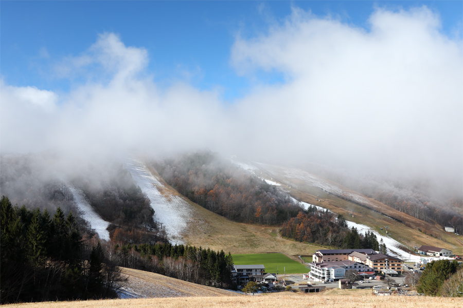 9時半頃に雲間ができて”菅平ブルー”と呼ばれる澄んだ青空が覗くようになりました。裏ダボスウェーブコースから裏太郎ゲレンデを望むと、シーハイルコースと裏太郎チャレンジコースにもうっすらと雪が。尚、裏太郎ファミリーイースト(写真一番右)に最も近いホテルは写真右下の 菅平サンホテル です。