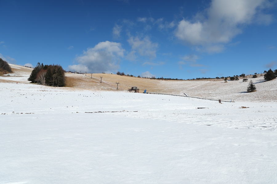 スキー場ボトムのファミリーコース(写真)にはしっとりとした雪が3~5cm積もっていました。シーズン中は同コース下部に子供専用の雪遊び場「アドベンチャーランド」がオープンします(※3歳以上の入場料は平日1,500円、土日祝2,500円)。ソリ専用ゲレンデやチュービングコース、沢山の遊具が置かれたエリアで構成される予定です。