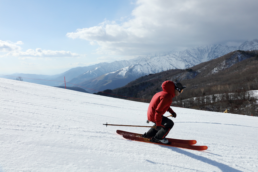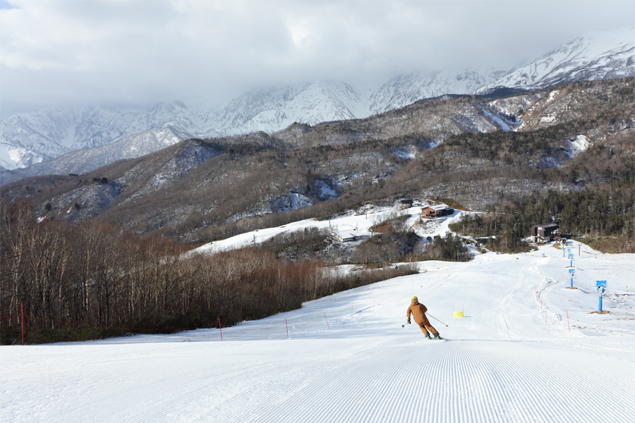 ゴンドラとつが第2ペアが動き、栂の森ゲレンデ(630m)1ゲレンデが滑れました。天然雪と人工雪が混ぜられプレスされた積雪50cm、幅20~30mの湿雪バーンは、最初から緩んで板が気持ちよく走るコンディション。中盤以降に多少うねりがあったものの滑りに影響はありませんでした。