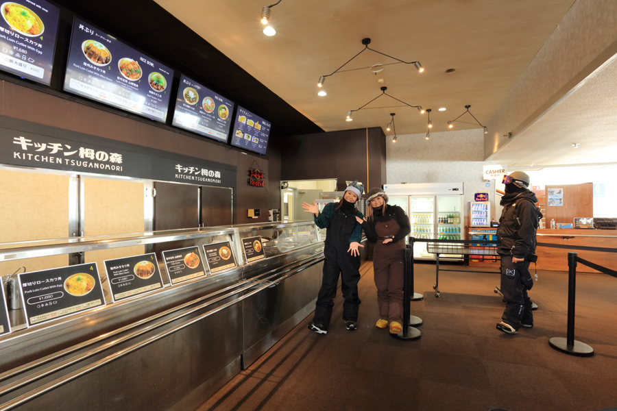 小谷村と白馬村からのお2人(写真)が「いつも見てます!5本くらい滑りましたが、感覚を取り戻すのが大変です。」とお話しくださいました。10時に開店した キッチン栂の森 には早々に休憩する姿が。「栂の森スープカリー」(1,880円)、「背徳のローストビーフ丼」(2,080円)、「特製牛すじ丼」(1,680円)が今季新たにメニューに加わります(※今日はツガイケブラック、山賊焼丼など7メニューで営業)。