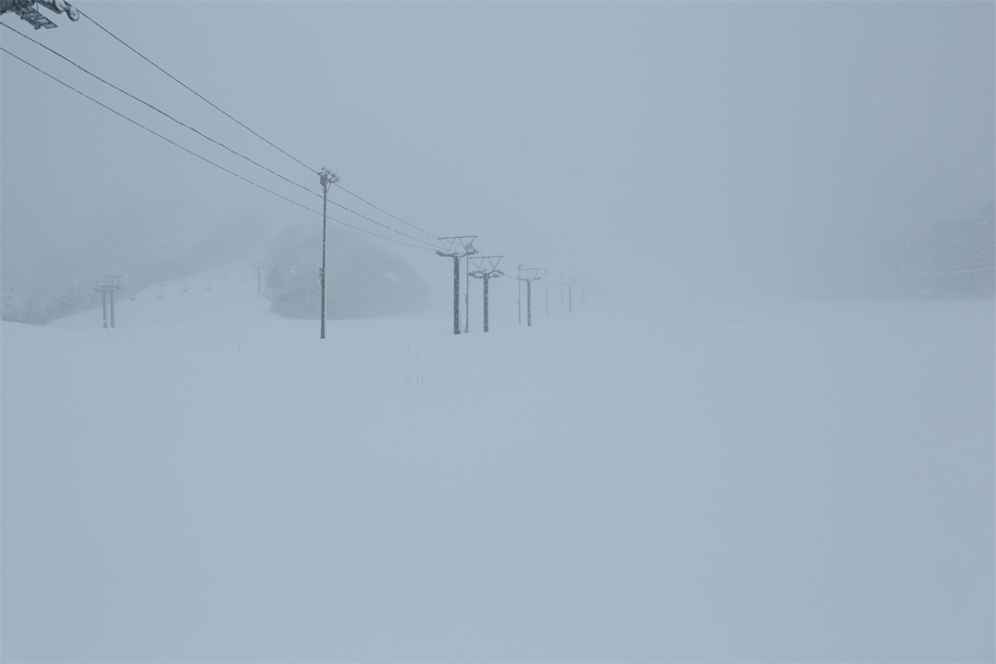 本気を出して来た冬将軍。昨日の午後からの雪が今朝8時現在、弱い北西風に乗って勢いよく降っていました。フカッとした新雪が、はくのりファミリーコース中~下部に約25cm、若栗中央ゲレンデ下部(写真)に約30cm積もっていました。